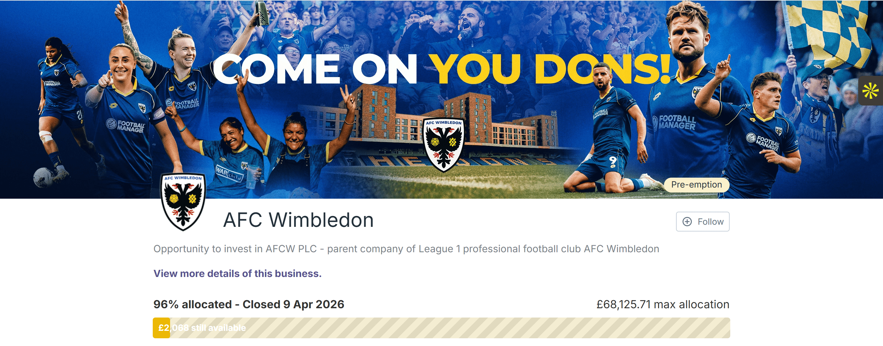 💸 AFC Wimbledon closed fan investment at a $33.7 million (£26.8 million) valuation through a crowdfunding initiative, with 96% of the $91k (£68k) allocated to 481 investors.
